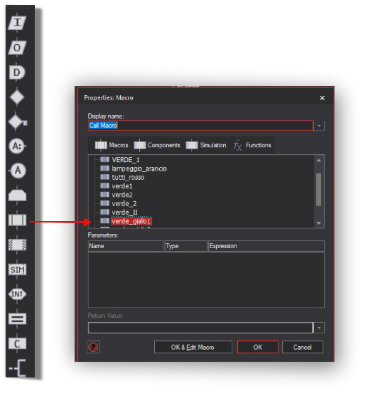 Dal menù MACRO, importo la Macro verde_giallo1 e la inserisco nel CICLO SEMAFORO verde1, dopo la Macro verde 1.