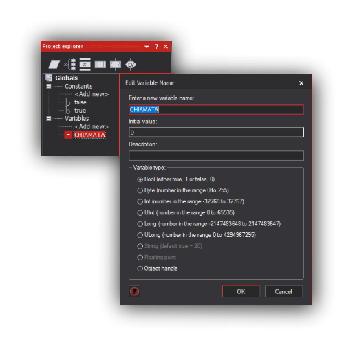 Da project explorer, aggiungo la variabile “CHIAMATA”, associata al pulsante/interruttore.