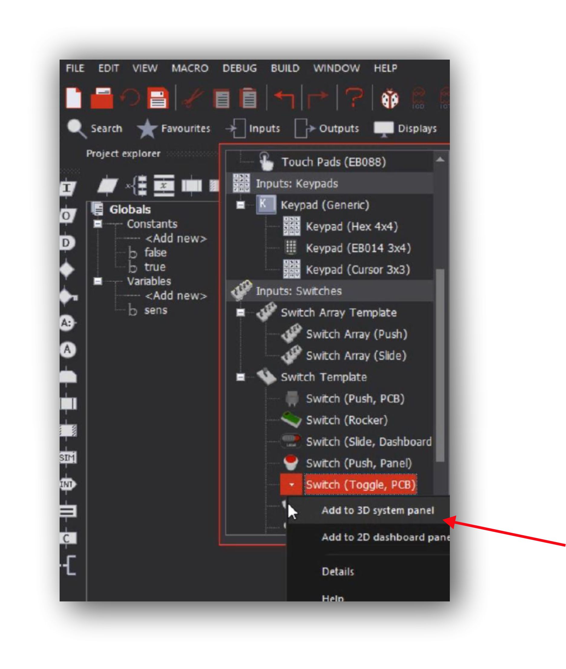 dal menù a discesa di INPUT, selezionare un interruttore tipo “toggle” (a leva), e aggiungerlo al “3D System panel” , per la simulazione.