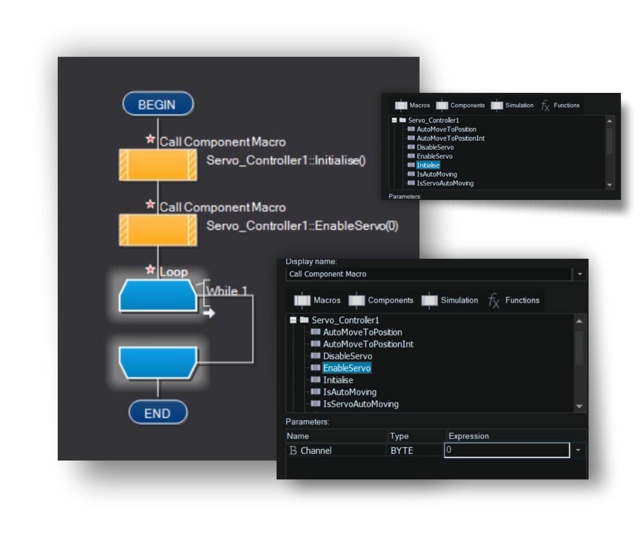 Nel diagramma di flusso, inserisco il Component Macro per “inizializzare” il Servo Motor control, e il Component Macro per abilitare il controllo del servocomando sul “canale 0”.